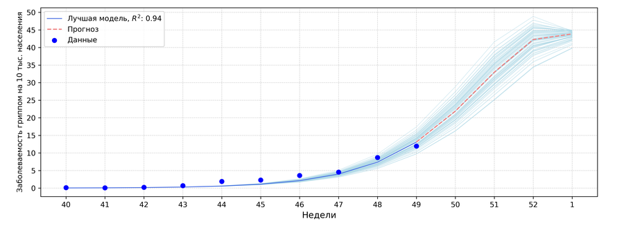 Рис. 13. Результаты моделирования заболеваемости гриппом с начала сезона по 49 неделю 2025г.