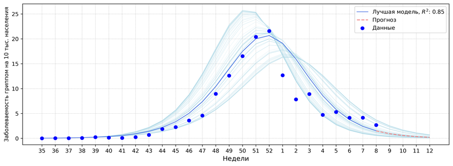 Проведен прогноз заболеваемости гриппом. Прогноз основан на модели Барояна-Рвачева: калибровка модели производилась по данным о зарегистрированных случаях заболеваний гриппом и ОРВИ и данных лабораторной диагностики гриппа (ПЦР) с начала эпидсезона (40 неделя) по предшествующую неделю, на которой публикуется прогноз. Данные представлены с шагом в одну календарную неделю. Поиск оптимальных параметров происходил при помощи калибровочных алгоритмов, в результате проводилось построение модельной кривой. Найденные параметры позволяют продолжить модельную кривую и сгенерировать прогноз на ближайшие 4 недели от даты наблюдения (неделя, за которую публикуется бюллетень).