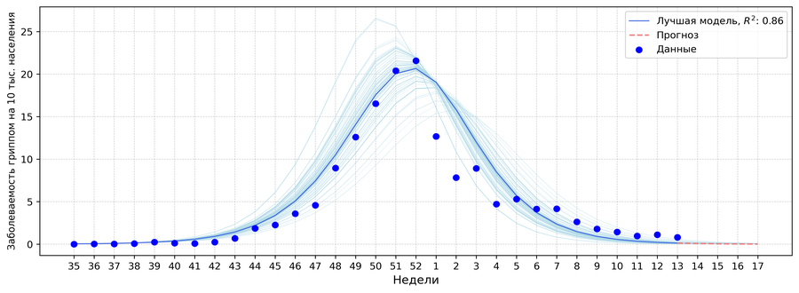 Рис. 13. Результаты моделирования заболеваемости гриппом с начала сезона по 13 неделю 2026г.