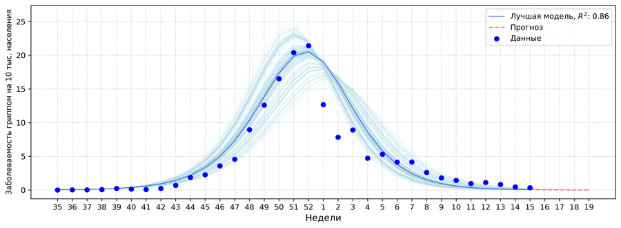 Рис. 13. Результаты моделирования заболеваемости гриппом с начала сезона по 15 неделю 2026г.