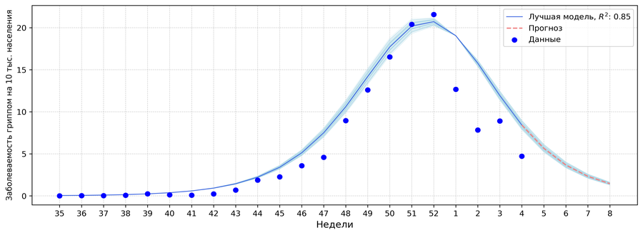 Рис. 13. Результаты моделирования заболеваемости гриппом с начала сезона по 04 неделю 2026г.